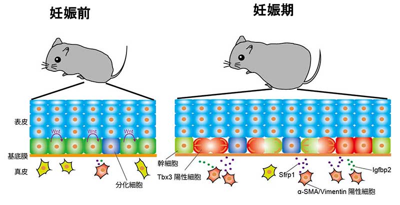 本研究グループは、マウスを用いて、急速に拡張する妊娠期の腹部の皮膚に着目し、その拡張メカニズムを解析しました。その結果、妊娠期には腹部表皮の奥に高い増殖能を持つ細胞集団が出現することを見出しました。この細胞集団の出現には転写因子Tbx3が必要であり、Tbx3を腹側皮膚で働かないようにしたマウスでは妊娠しても皮膚が拡張しにくくなることが分かりました。また、これらの表皮細胞の動きは、真皮に存在する細胞が分泌するタンパク質によって引き起こされることも分かりました。この増殖性の細胞集団は、皮膚の創傷時にも出現して傷の治りを促す働きがあります。真皮からの分泌タンパク質をマウスの皮膚内に注射してみたところ、傷の治りが早くなることも分かりました。
