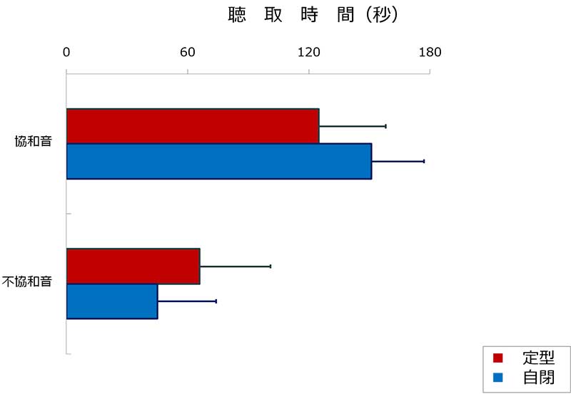 正高信男 霊長類研究所教授は、自閉症を持つ子どもが健常児と比べ不協和音そのものをあまり好まない傾向があることを発見しました。一方で、音楽的な効果を狙い意図的に不協和音が使われている楽曲を健常児よりも長い時間聴き続ける傾向があることも確認しました。自閉症を持つ子どもは不協和音やその楽曲中での使われ方に関して健常児とは異なる反応を示しており、ある種「早熟した」音楽の好みを持つことを示唆する結果です。