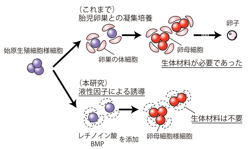 本研究は、多能性幹細胞から生体材料を用いず卵子を形成する方法開発のさきがけとなります。今回の研究によって、卵母細胞が誘導される詳細な分子機構の解明が促進され、また、ヒト多能性幹細胞からヒト卵母細胞を誘導する研究が促進されることが期待されます。