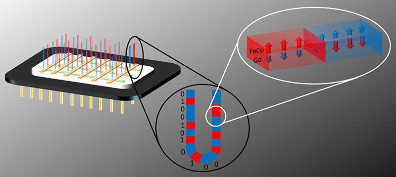 図:磁壁移動型メモリデバイスの模式図。細線をフェリ磁性体にすれば、超高速に動作するメモリが実現可能