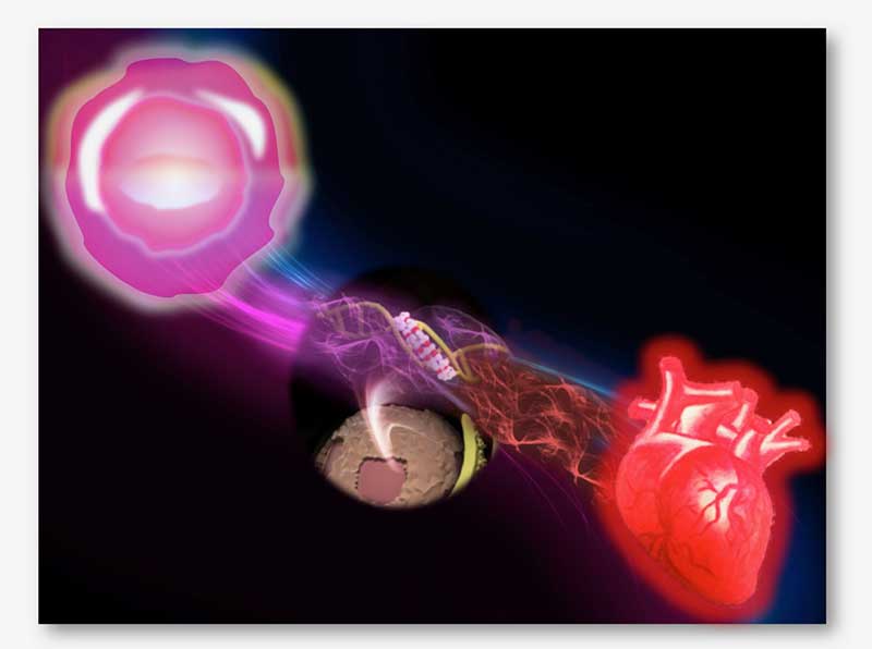 図:今回開発したPIP-S2がDNAに結合して幹細胞内の遺伝子情報を切り替え、幹細胞の心筋細胞への変化を誘導する様子を描いたイメージ。(制作:Sudhakar KeerthiPriya)