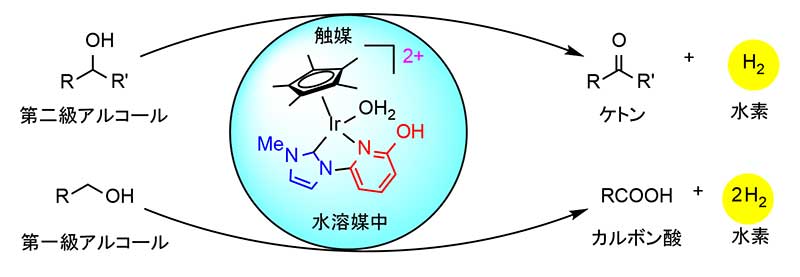 本研究グループではこれまでにも、水溶媒中でアルコールの脱水素的酸化反応を実現するイリジウム触媒を開発してきました。しかしその触媒活性は十分に高いとはいえず、より高活性な触媒の開発が望まれていました。今回の研究では、触媒分子の設計を見直し、新しい機能性配位子を合成してイリジウムに結合させた新規触媒を合成し、その性能を調査しました。
