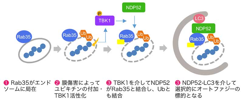 その結果、細菌が細胞内部へ侵入する際に利用するエンドソームの膜やミトコンドリア膜に存在する、Rab35と呼ばれるタンパク質がオートファジー受容体を呼び寄せることで、不要物をオートファゴソームへ包み込みませ、不要物の分解を促進していることが明らかになりました。