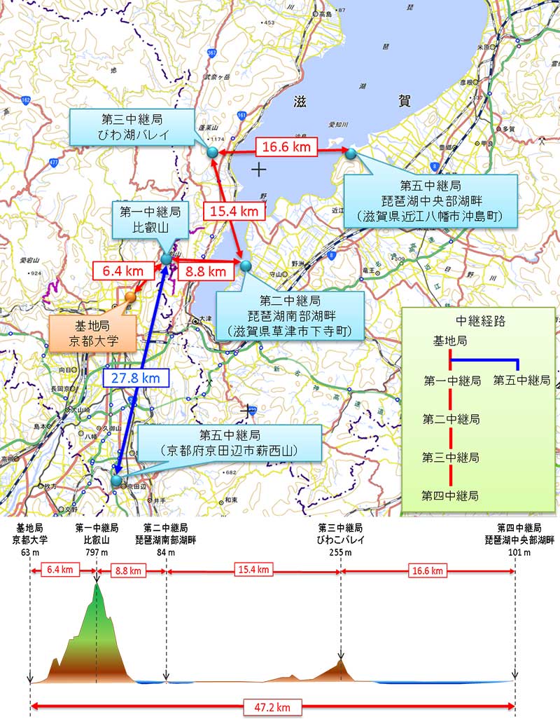 (出典:Geospatial Information Authority of Japan「(国土地理院の地理院地図(電子国土Web)「京都市付近」)を利用して無線局の情報位置、局間の距離を記載」)
