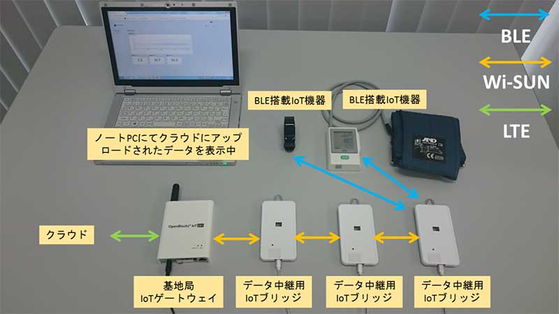この通信システムを用いて、Bluetooth搭載ウェアラブル機器およびBluetooth搭載マルチセンサー携帯型自動血圧計を接続し、環境・生体信号を同時にクラウド上に整備された超ビッグデータ創出基盤上に伝送することを確認しました。