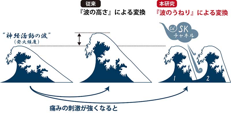 痛覚神経細胞が強い痛みを感知すると、カルシウム依存性のSKチャネル(北風)によって神経活動の波のくぼみが生成され、波のうねりが増加する。このうねりが強い痛みの信号として、下流の神経ネットワークに伝播する。従来は波の高さのみが痛みの強さに影響を与えると考えられていた。
