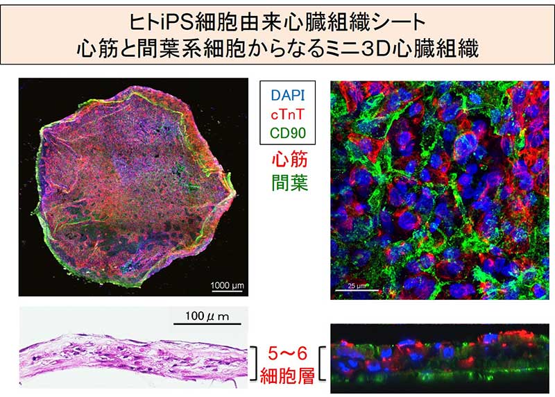 - ヒトiPS細胞から分化誘導した心筋細胞および間葉系細胞を用いて、3次元的な心臓組織を作製した。