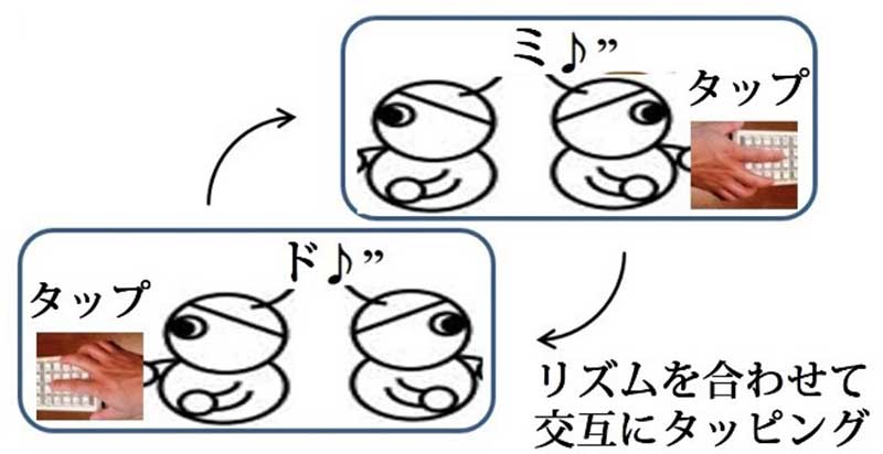 二者がそれぞれ相手と同じ時間間隔になるように(つまりリズムが合うように)、交互にキーボード押し(タッピング)を行う課題である。1名がタッピングすると音階の「ド」の音が、もう1名がタッピングすると「ミ」の音が、イヤホンより呈示された。