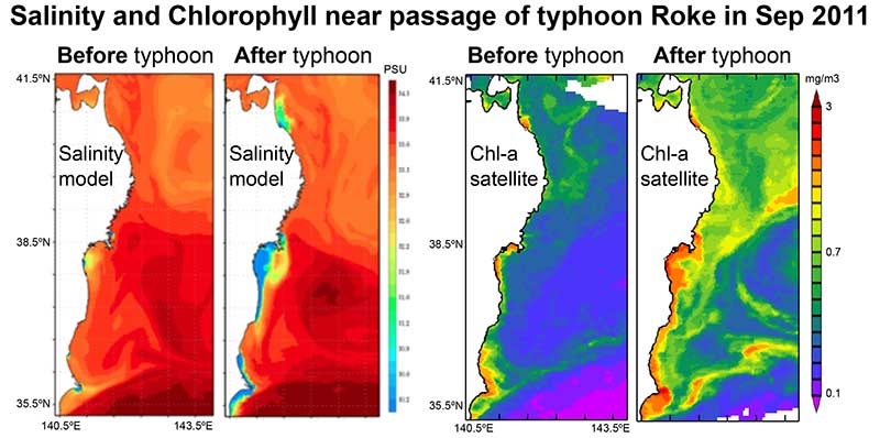 図:(左)モデルを用いて計算された塩分濃度(Roke台風通過前と通過後)、(右)衛星リモートセンシングを用いて観測された海洋のクロロフィルa濃度(Roke台風通過前と通過後)。淡水が広がっている領域に、植物プランクトンの顕著な増加が確認できる。