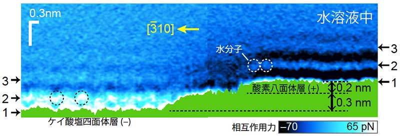 本研究グループは、クリノクロアと呼ばれる層状ケイ酸塩鉱物結晶の一種と水溶液との境界に着目しました。この結晶は正電荷をもつ酸素八面体層と、負電荷をもつケイ酸塩四面体層が交互に積層した特徴的な構造をもつため、異なる電荷を持つ表面における水分子の分布の違いを可視化するのに適したモデル試料となっています。本研究では、原子間力顕微鏡(AFM)による3次元フォースマップ法(観察したい領域の表面上の全ての3次元空間で、AFM探針にはたらく力を探針振動の周波数の変化として捉え、試料表面上の相互作用力の3次元分布を求める手法)を用い、クリノクロア表面の水和構造可視化に成功しました。