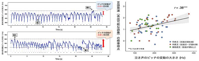 その結果、(1)予定日前後の時点では、在胎32~37週未満で出生した早産児の泣き声は、満期産新生児に比べてピッチの変動が大きく、メロディー複雑さの度合いも高い、(2)周産期の泣き声のピッチの高さ自体は、1歳半時点の言語・認知発達と関係しない、(3)周産期の泣き声のピッチの変動が大きい児ほど、1歳半時点で言語・認知発達が早く、特に発話できる語彙数が多い、ということが明らかになりました。