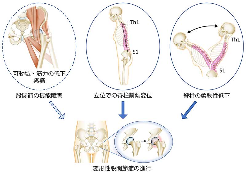 建内宏重 医学研究科助教、市橋則明 同教授らの研究グループは、立っている時の脊柱の傾きと脊柱の柔軟性低下が、変形性股関節症の進行に関わる重要な要因であることを明らかにしました。これは、リハビリテーションの現場で比較的容易に評価可能であり、かつ、運動により改善させられる要因の中から変形性股関節症の進行に影響を与える要因を明らかにした初の報告です。