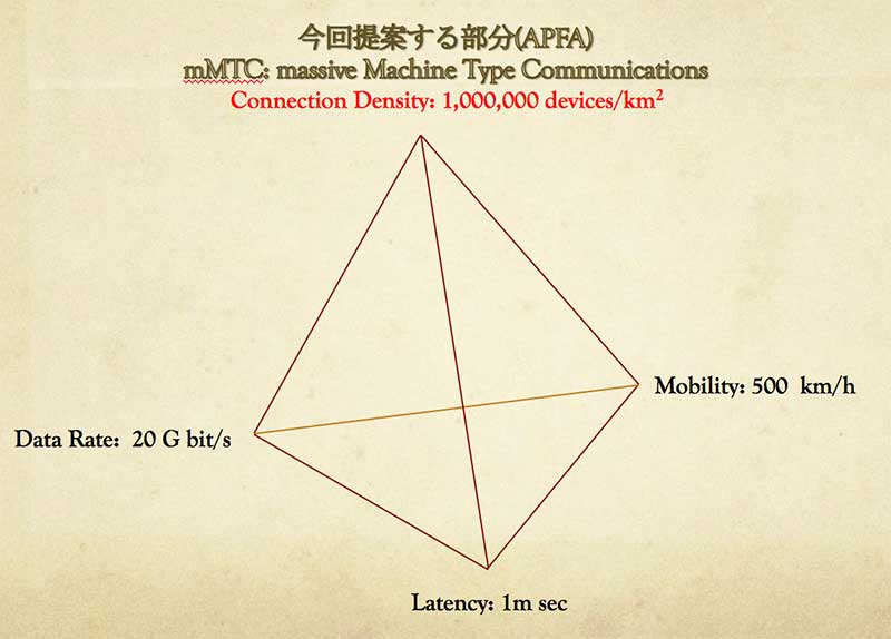 物と物とを通信回線でつなぐIoT時代の到来が予見されて久しい今日、1km 2 あたり100万個のデバイスの通信を可能とする5G方式の模索が始まっています。通信量の増大に対応するべくセンサ同士の通信や中継方式が様々に提案されてきており、世界各国から国際電気通信連合無線通信部門(ITU-R)の要求を満たす方式の提案が始まっています。日本では、電波産業会(ARIB)高度無線通信研究委員会標準化部会無線インターフェース提案検討会において、ITU-Rへ日本として提案すべき5G提案方式を受け付けていましたが、本研究グループは、1km 2 あたり100万個のデバイスの通信を可能とする5G方式を、5G無線インターフェース(IMT-2020無線インターフェース)の日本提案候補案として正式提案しました。