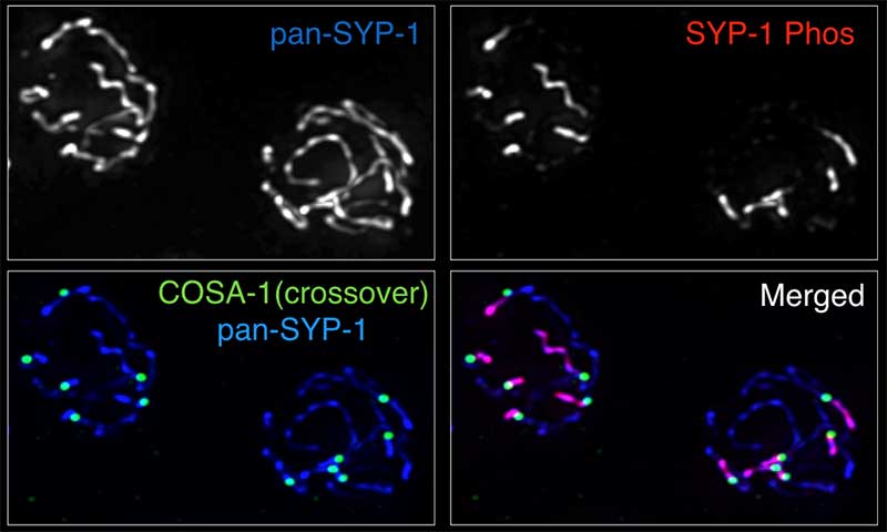 線虫のSYP-1タンパク質は、哺乳類における減数分裂タンパク質SYCPと同様の働きを、線虫の生殖細胞において担っていると考えられています。このタンパク質は、減数分裂前期に相同染色体同士の間に構築されるシナプトネマ複合体の中央部に位置するタンパク質です。様々なモデル生物において、シナプトネマ複合体タンパク質群の多くが減数分裂前期にリン酸化修飾を受けることが知られていましたが、その生物学的意義には謎が多く残されていました。
