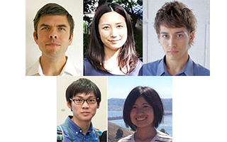上段左よりカールトン准教授、佐藤-カールトン研究員、シャテラン技術補佐員、下段左より内野技術補佐員、中村-田淵技術補佐員