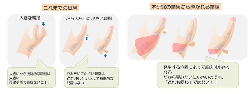 本成果は、これまでの親指多指症の概念を変えるものであり、治療法の発展に加えて発生のメカニズムを解き明かす上でも重要な発見です。