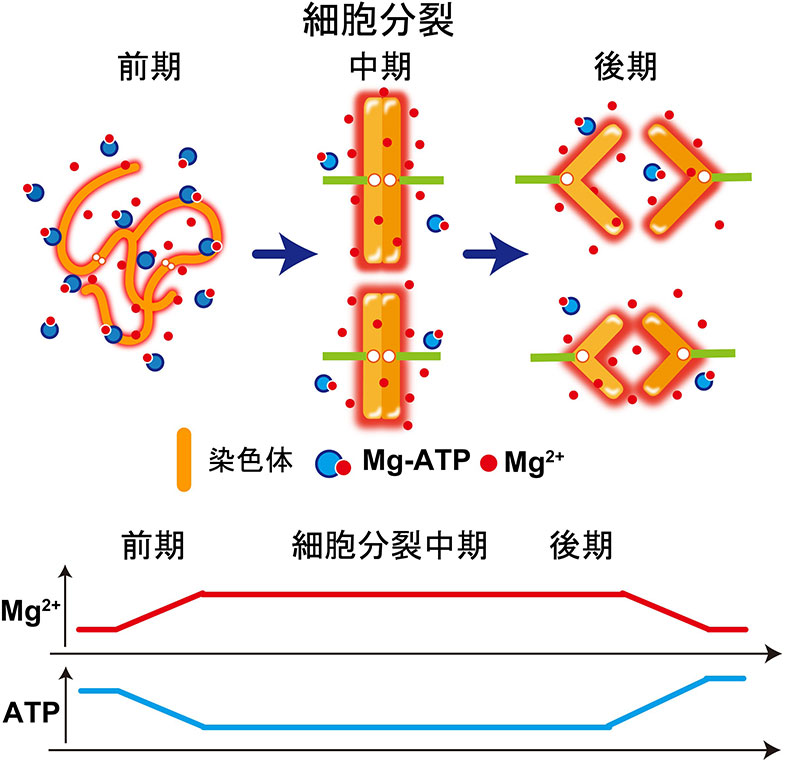 図:細胞が分裂する際にMg 2+ が増加し、染色体の凝縮が促進される。細胞内活動のエネルギー源であるATPの減少により、Mg-ATPから遊離したMg 2+ が供給される。