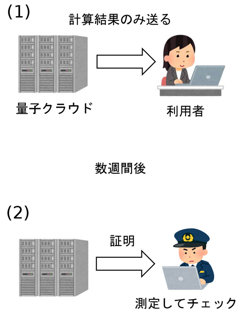 クラウドからは量子結果の正しさの証明がエンコードされた量子ビットが送られてくるので、利用者はその量子ビットをもとに自身の通常のコンピューターで正しさのチェックができる。