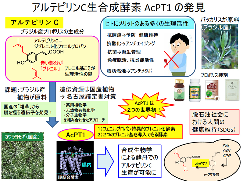 このユニークな酵素は、単独でフェール基質の p -クマル酸に2つのプレニル基を導入することのできる初めての植物酵素であることが明らかとなりました。実際に本遺伝子を使い、ブラジル産植物の主成分であるアルテピリンCを酵母で生産させることに成功しました。