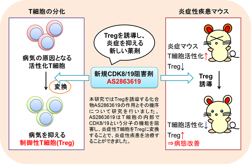 Tregは免疫を抑える機能を持つT細胞です。このTregを人工的に誘導することは、自己免疫疾患や炎症性疾患など免疫系の活性化を原因とする病気の治療に繋がると考えられます。本研究ではTregを効率よく誘導する化合物を探索し、AS2863619を発見しました。AS2863619はシグナル伝達分子であるCDK8/19の機能を阻害することで、免疫疾患の原因となる抗原に特異的なT細胞をTregに変換することが証明され、この化合物が強力なTreg誘導薬であることが明らかとなりました。また、皮膚炎症やI型糖尿病、脳脊髄炎のモデルマウスにAS2863619を投与することで、マウス中のTregが増加し、炎症病態が抑制されることも示されました。