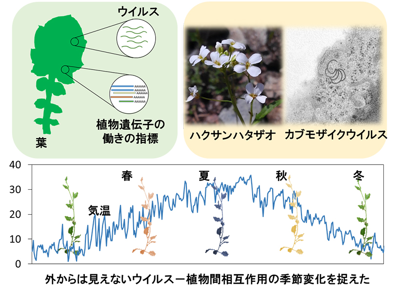 本研究グループは、アブラナ科のハクサンハタザオの自然生育地において、感染した同植物の体内でのカブモザイクウイルスの量の変化を3年間に渡って追跡調査しました。また、植物の葉で機能している全遺伝子を対象に、ウイルス感染がどのように遺伝子の働きを変化させるかについて、RNAシーケンシングを用いて四季を追って明らかにしました。その結果、カブモザイクウイルスは一度感染すると植物体内から排除されず、季節に応じて植物体内での分布を変化させながら継続的に保持されるとともに、ハクサンハタザオは感染状態でも、季節ごとにウイルスへの防御法を変えながら長期にわたって生存・成長し、開花・結実や栄養繁殖を行うことが明らかになりました。