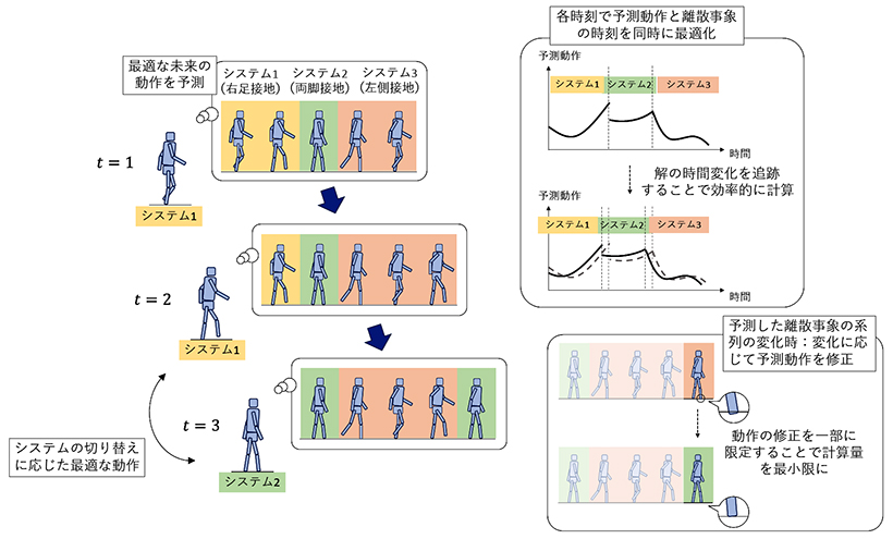 時々刻々変化する状況に応じて、最適な未来の動きを実時間で計算しながら制御を行うモデル予測制御は、自動運転や電力システムなど幅広い応用に向けて活発に研究されています。しかし、制御対象のモデルが離散事象を伴うときには場合分けが生じ、計算が膨大になるため、モデル予測制御の実現は困難でした。このような例としては、地面と足の接触に応じて速度が不連続に変化し、運動方程式が切り替わる2足歩行ロボットがあげられます。