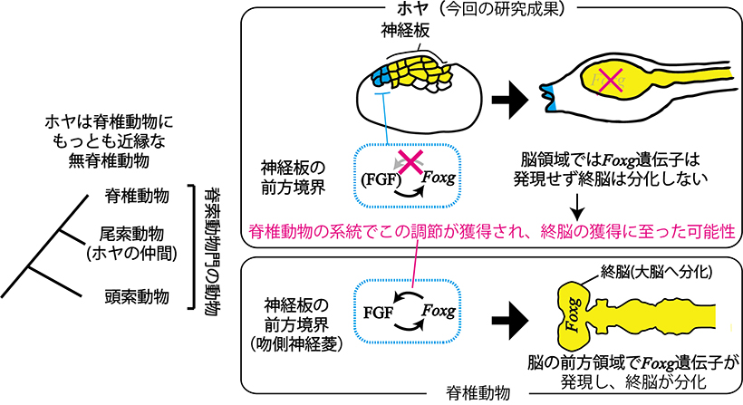ホヤでは Foxg は潜在的にFGF分子による制御を受けますが、 Foxg 遺伝子はFGFシグナル分子の発現を誘導できず、ループ状の遺伝子調節回路が未完成でした。脊椎動物とホヤの祖先が分岐した後の脊椎動物の進化の過程で、 Fgf 遺伝子がFoxgによって活性化されるようになり、それが終脳の誕生につながったと考えられます。