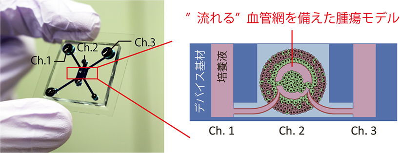 図:腫瘍モデルへの血管導入、培養に利用したマイクロ流体デバイス。(左)デバイスの写真(青:チャネル(流路))、(右)血管を構築した腫瘍モデルの模式図。