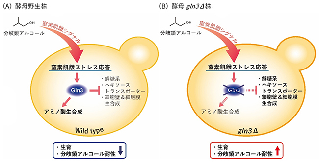 本研究成果は、分岐鎖アルコールによる生育阻害が、本来細胞に備わっているストレス適応メカニズムを介して引き起こされるという、分岐鎖アルコールの細胞毒性機構を解明した初めての知見であり、酵母による医薬品を含む様々な化成品の生産性を増大させる上でも重要な代謝工学・合成生物学の戦略を提唱するものです。