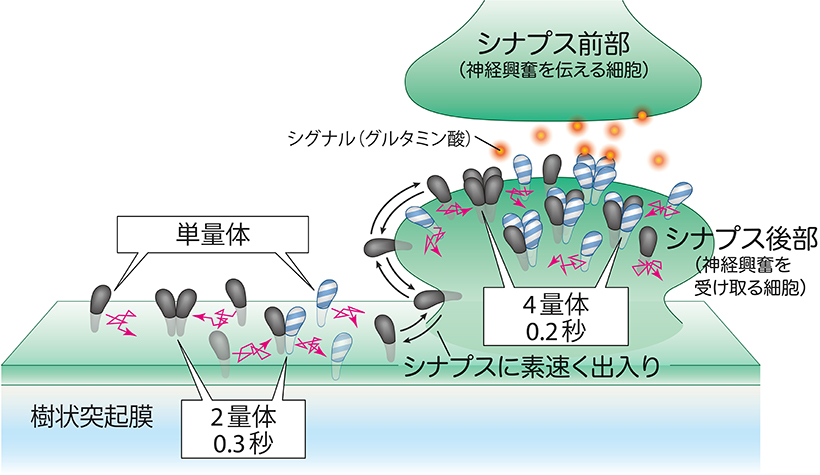 しかし、本研究によって受容体の4つのパーツは0.1秒ほどでバラバラになり、それらがまたすぐに違うパーツと集まって4個で受容体を作って0.1秒間働き、またすぐにバラバラになるということを繰り返す、という驚くべき仕組みで働いていることが明らかになりました。この仕組みを使うことで、神経細胞は環境変化や刺激に応じて、ただちに適した受容体をシナプスで作ることができます。また、4つのパーツに分けて運ぶことでシナプスに受容体を集めるのも素早くなることが分かりました。このような新事実の解明は、分子を1個ずつの分解能で観察して追跡するという新たな手法(1蛍光分子イメージング法)によって可能になりました。