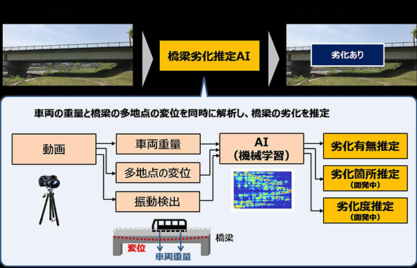 本技術は、橋梁と橋梁上を走行する車両を動画撮影し、車両の重量を推定したうえで、橋梁の複数点のたわみ(変位)から橋梁が劣化しているかをAIで推定します。橋のたわみは劣化だけでなく、車両の重量によって影響をうけるため、車両の重量を推定したうえで橋のたわみを解析することが、劣化を正しく推定することにつながります。また、車両通行量や設置環境などそれぞれの橋梁の状況が異なるため、定期点検やモニタリングで橋梁ごとのデータを蓄積することで、AIでの劣化推定精度がより向上していくことが期待されます。