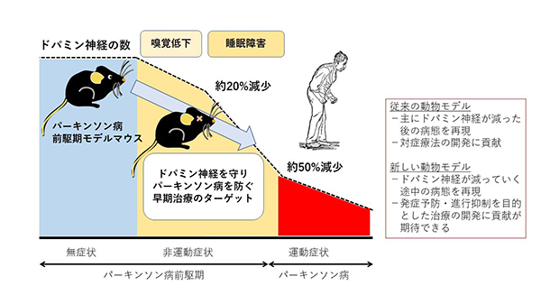 PDはドパミン神経の変性をきたす進行性の難病の一つであり、日本では15~20万人の患者が存在しています。PDの治療については、ドパミンを補充するなどの対症療法は存在しますが、発症を予防したり進行を抑えることができる根本的な治療法はありません。PDは診断の時点でドパミン神経細胞が5割前後に減少しているため、これらの治療法の開発には発症前(前駆期)に病気を診断し治療を開始する必要性が唱えられているとともに、この前駆状態を忠実に再現した動物モデルの開発が待ち望まれていました。