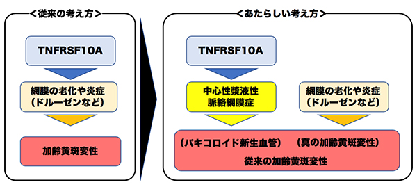 本研究において同定した 中心性漿液性脈絡網膜症に強く関与する2つの遺伝子 のうち TNFRSF10A は、過去に加齢黄斑変性に関与する遺伝子として報告されていますが、今回の研究成果からはむしろ、パキコロイド新生血管と関連する遺伝子であった可能性が考えられます。今後規模を拡大した解析を行うことで、真の加齢黄斑変性とパキコロイド新生血管を精緻に切り分けることが可能となり、より個別化した医療の提供が可能になると考えられます。