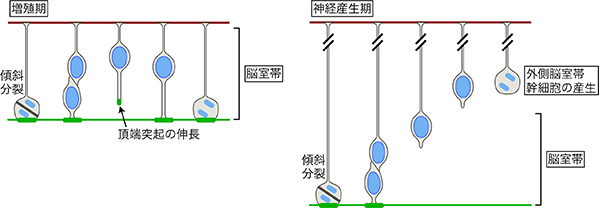 今回、本研究グループは多光子顕微鏡などを用いて、マウス胎仔の脳組織に存在する神経幹細胞の形状変化を鮮明に捉えることに成功し、神経幹細胞が柱状の形態を柔軟に再形成することを明らかにしました。この再生能により、脳発生初期(図:増殖期)に神経幹細胞が細胞分裂するとき柱状構造が分断されたとしても、脳組織の細胞配置が保たれます。脳発生後期(図:神経産生期)になるとこの性質は失われ、柱状構造が分断された神経幹細胞が次第に蓄積していき、脳組織の中には別の神経幹細胞層が出現することも分かりました。この新たな幹細胞層の出現は、特にヒトのように大きくしわのある脳が形作られる際に見られる特徴であることが分かっており、今回の発見はその裏に潜む細胞の振る舞いを明らかにしたといえます。
