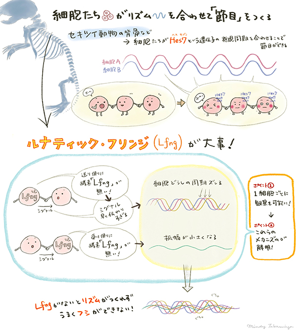 本研究では、新規の黄色蛍光タンパク質Achillesを用いたマウス胚のライブイメージングにより、Hes7遺伝子の発現量を1細胞レベルで計測し、個々の細胞での振動の様子を可視化することに成功しました。この系を用いて、糖転移酵素の一種であるLunatic fringe遺伝子が、細胞間のシグナルの伝達に適切な遅れを生み出し、これが同期を促進することを明らかにしました。本研究成果は、先天性脊柱側弯症などの遺伝疾患の発生メカニズムや、ホタルの集団発光やメトロノームの同期現象などといった自然界に普遍的にみられるリズム現象の同期メカニズムの理解につながると期待されます。