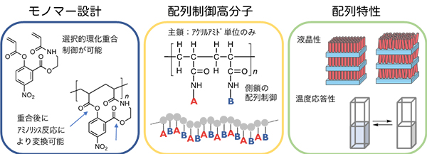 さらに、フランソワ・トゥーニヤック パリ市立工業物理化学学校(ESPCI Paris) CNRS研究員と共同で、長鎖アルキル基を導入すると、交互共重合体が液晶性を示すことを明らかにしました。同じ組成のランダム共重合体は液晶性を示さなかったことから、配列制御によって新しい特性を発現することが分かりました。他に配列特異的な温度応答性挙動も見いだしました。