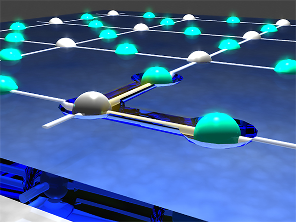 図:リープ格子のイメージ図。中央に示された3つの格子点が空間断熱移送に必要な3つの容器に対応する。