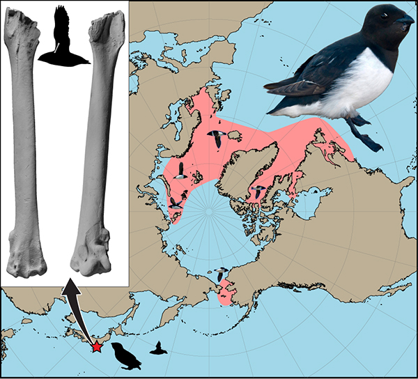 ヒメウミスズメは現在ではほぼ大西洋と北極海にのみ分布しており、日本などの太平洋沿岸の中緯度域では極めてまれにしか見られません。今回の化石の産出は、かつてこの仲間が日本近海にも比較的普通に生息していた可能性を強く示唆しています。したがって、ヒメウミスズメ類は化石の時代(約70万年前)から現在までの間に太平洋における分布を縮小したことになります。ヒメウミスズメが現在大西洋で最も繁栄している海鳥であることを考えると、この仲間が太平洋で分布を縮小したことは奇妙でさえあります。このような分布の縮小が起こった原因は現時点では不明であり、今後のさらなる化石の発見と研究の発展が待たれます。