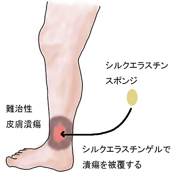 今回開発した新規治療材料は人工タンパク質シルクエラスチンで作製されており、感染しやすい慢性創傷に対しても有効な材料であることを動物実験等で確認しました。その後、本学医学部附属病院で2018年2月から12月まで、下腿難治性皮膚潰瘍を対象として、シルクエラスチンスポンジを用いた医師主導治験を行い、本材料の安全性を確認しました。この医師主導治験の成果を受けて、2020年1月から企業治験を開始することが決定しました。