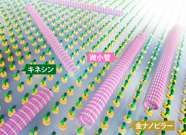 横川隆司 工学研究科 教授、金子泰洸ポール 同教務補佐員らの研究グループは、大岩和弘 情報通信研究機構(NICT) 主管研究員、古田健也 同主任研究員と共同で、モータータンパク質(以下、モーター)であるキネシン分子を自在に配置する手法を開発しました。