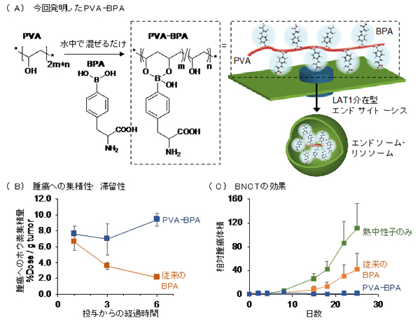 鈴木実 複合原子力科学研究所教授、野本貴大 東京工業大学助教、西山伸宏 同教授らの研究グループは、液体のりの主成分であるポリビニルアルコールを中性子捕捉療法用のホウ素化合物(ボロノフェニルアラニン=BPA)に加えるだけで、その治療効果を大幅に向上できることを発見し、マウスの皮下腫瘍をほぼ消失させることに成功しました。