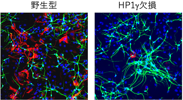 図:神経幹細胞の分化を誘導したところ、HP1γ欠損細胞ではアストロサイト(赤色)が少なく、ニューロンが多く見られた(緑色)。青色:細胞核。