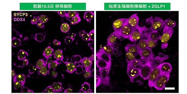 図:胚齢15.5日目のマウス卵母細胞(左)、転写因子 ZGLP1の効果により卵母細胞へと分化した始原生殖細胞様細胞(右)