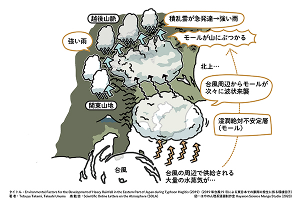 Tetsuya Takemi, Takashi Unuma (2020). Environmental Factors for the Development of Heavy Rainfall in the Eastern Part of Japan during Typhoon Hagibis (2019). SOLA, 16, 30-36.