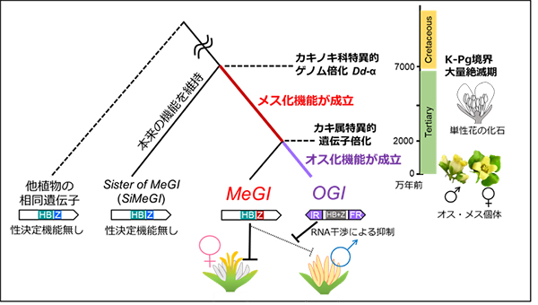 日本人にはなじみの深いカキですが、 100年以上も謎に包まれていた「植物の性別」を決定する遺伝子がカキ属植物で最初に発見されたことから、カキ属植物は、作物の栽培や育種にとって非常に重要な「植物の性」の研究でも世界的に注目されています。本研究で解読された全ゲノム配列から、カキ属の性決定遺伝子「 OGI 」や「 MeGI 」は、カキ属の進化に特異な「全ゲノム倍化」によって生じたものであり、本来は性に関与していなかった遺伝子が進化の過程で、新しく性決定遺伝子に変化したことが明らかになりました。