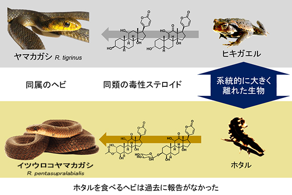 本研究グループは、このイツウロコヤマカガシの頸腺を分析し、毒液の成分がホタルに由来するブファジエノライドの一種であることを同定しました。さらに、イツウロコヤマカガシが実際にホタルを捕食することを確認しました。これは、ヤマカガシ属内でイツウロコヤマカガシへ進化する過程で、カエル食からミミズ食へ食性が変化し、それに伴いブファジエノライド源としてヒキガエルではなくホタルを利用するようになったことを示します。このように系統的・生態的にかけ離れた餌へ毒源が移行する例は他になく、本研究成果は、ヘビの生態および動物の食性変化の研究に新たな視点を提供する画期的なものです。