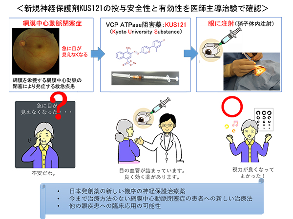 網膜中心動脈閉塞症は、目の血管が閉塞することによって重度の視力障害を引き起こす病気で、視力改善の標準的治療は存在しません。KUS121は、VCPという蛋白質のATPase活性に対する阻害剤として垣塚彰 生命科学研究科 教授らが中心となって研究開発してきた、新規の細胞保護剤です。今回の治験は、KUS121を初めてヒト(患者)に投与する第1/2相試験であり、本治験で投与安全性と有効性が確認されました。