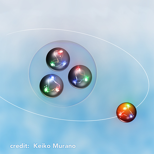 通常の原子核は核子というバリオンから構成されていますが、グザイ(Ξ)粒子と核子からなるハイパー核については、どのような種類のものが存在するかほとんど分かっていませんでした。今回、本研究グループは、クォークの基礎理論「量子色力学(QCD)」に基づき、グザイ粒子と核子の間に働く力をスーパーコンピュータ「京」などを用いて明らかにしました。さらに、得られた力をもとに量子少数多体系の精密計算を行うことで、グザイ粒子1個と核子3個の計4個のバリオンからなる新たなハイパー核「グザイ・テトラバリオン」の存在を予言しました。