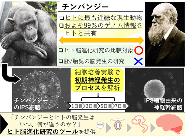 北島龍之介 霊長類研究所 博士課程学生(研究当時)、仲井理沙子 同博士課程学生、今村公紀 同助教らの研究グループは、今村拓也 九州大学 准教授らと共同で、チンパンジーの皮膚の培養細胞からiPS細胞を作製し、初期胚から胎生期にかけて進行する初期神経発生を細胞培養実験で誘導、解析することに成功しました。