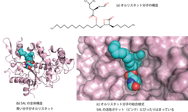 また、抗肥満薬として市販されているヒトリパーゼ阻害剤「オルリスタット」が既存のSAL阻害剤よりも200倍以上SALの活性を阻害することを発見しました。更に、SALとオルリスタットとの複合体の構造を原子レベルで解析することによって、オルリスタットによる阻害のメカニズムを解明することに成功しました。